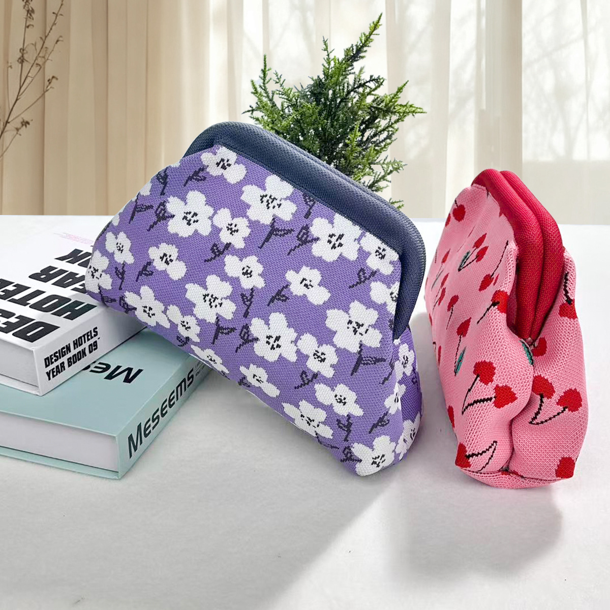 复古波点针织化妆包ins风撞色便携大容量随身化妆收纳手拿包女