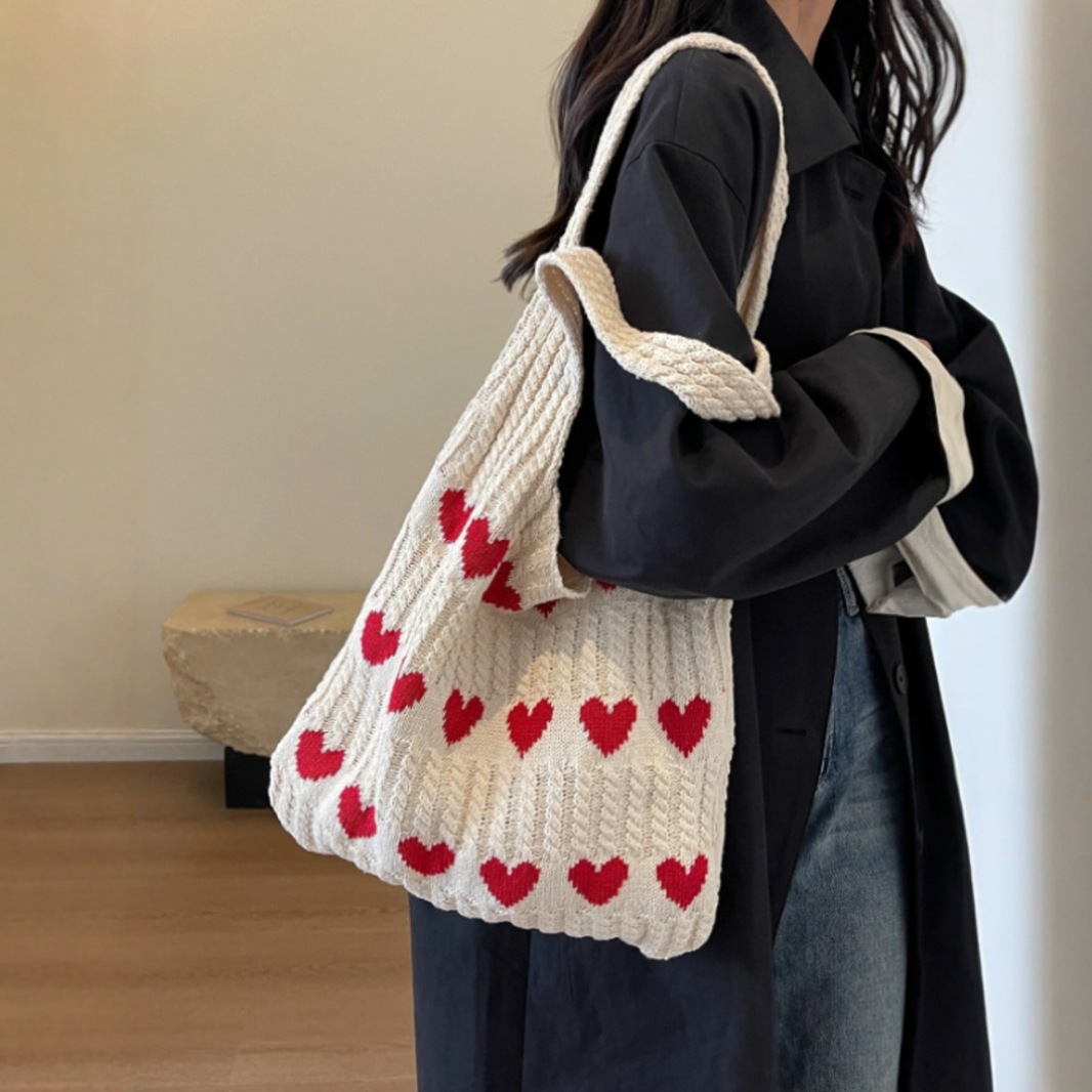2025针织爱心托特包早秋新款小清新简约时尚针织包个性洋气单肩包