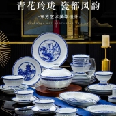 景德镇青花玲珑高温釉下彩家用餐具套装鱼盘高脚碗面碗高档礼盒装