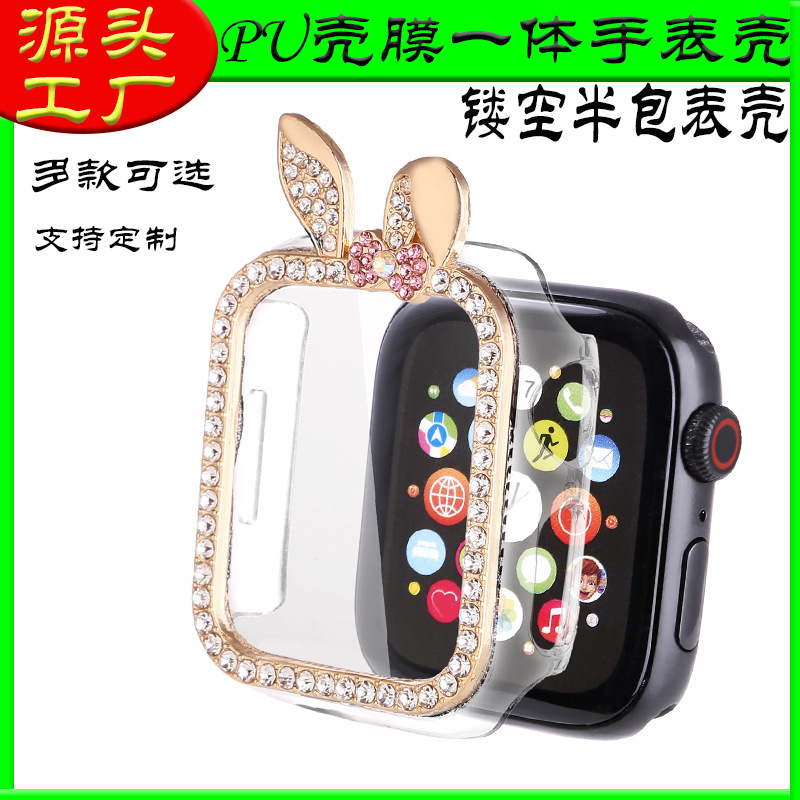 适用苹果手表镶钻兔子S10一体钢化膜保护壳iwatch567SE8代手表壳