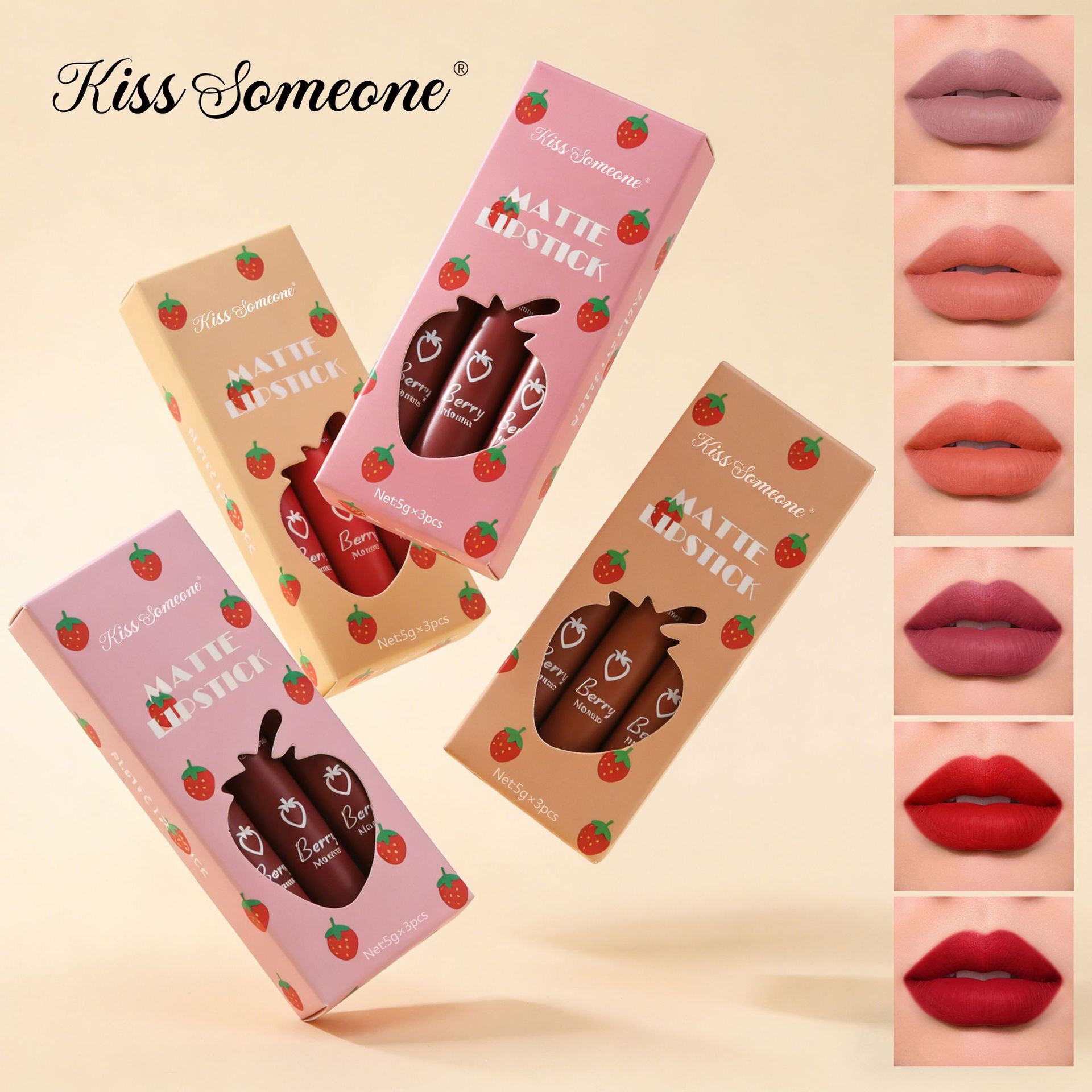 跨境3只草莓套装套盒丝绒雾面哑光唇釉口红唇彩女不粘杯可爱套装