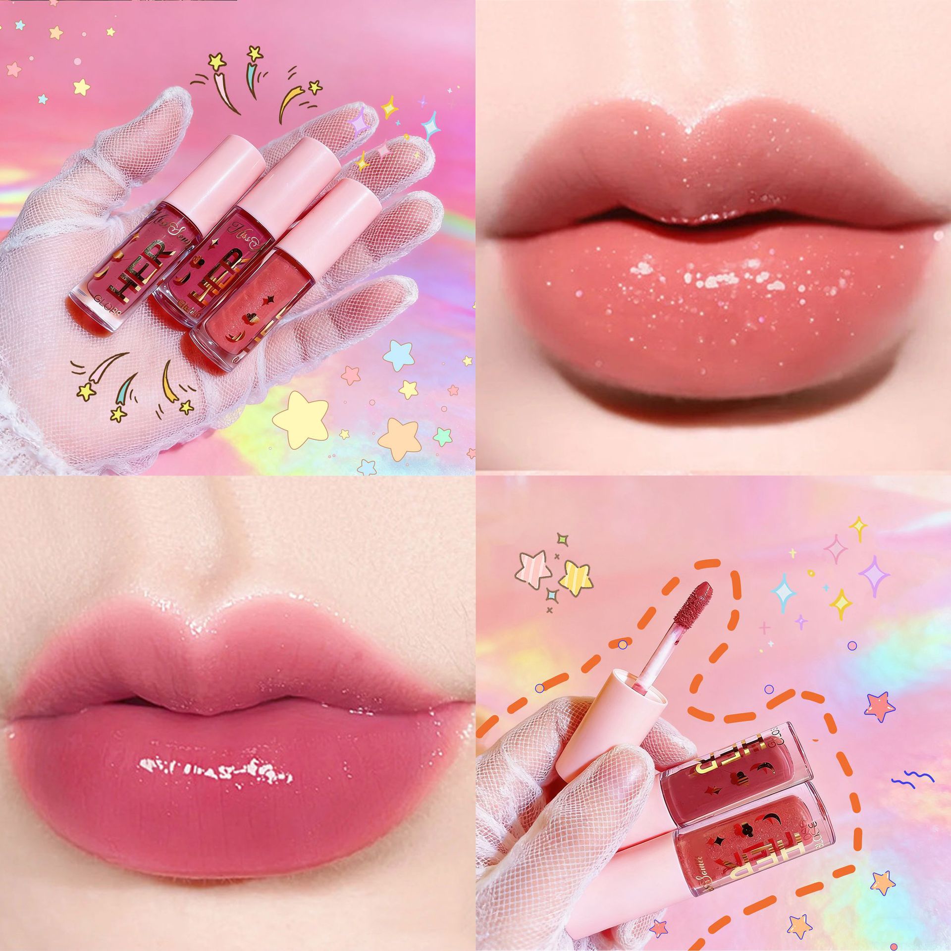 跨境唇釉4只装粉色套盒唇彩外贸彩妆嘟嘟唇唇部美妆亮片唇釉套装