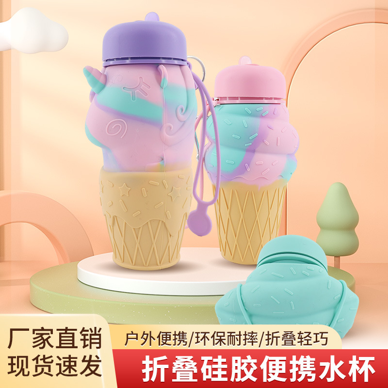 网红创意硅胶折叠水壶独角兽跑步健身便携水杯冰淇淋户外运动水杯