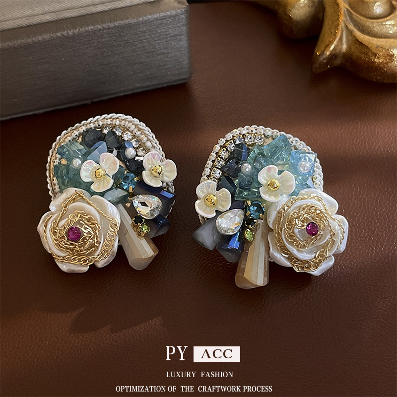 银针珍珠镶钻水晶花朵耳环欧美复古宫廷风耳钉个性气质耳饰批发女