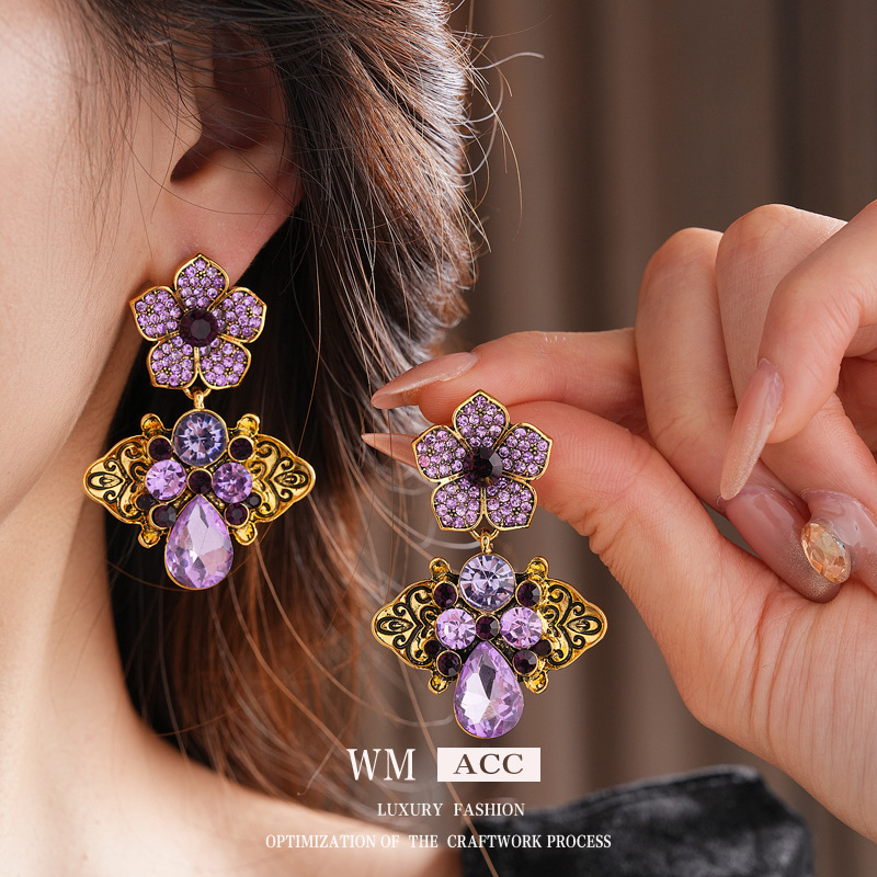 中古vintage镶钻耳环银针花朵椭圆水滴耳钉轻奢高级感复古耳饰女