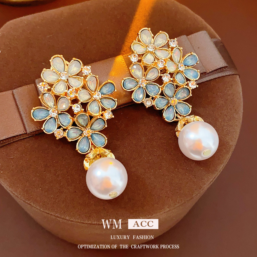 中古vintage轻奢时尚耳环银针镶钻花朵珍珠耳钉高级感复古耳饰女