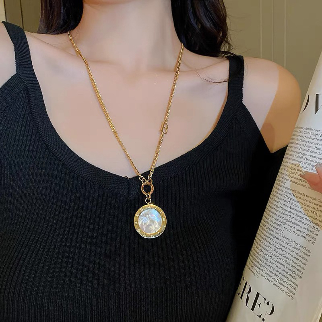 钛钢罗马圆牌女项链项圈饰品潮流新款毛衣链小香风吊坠高级感首饰