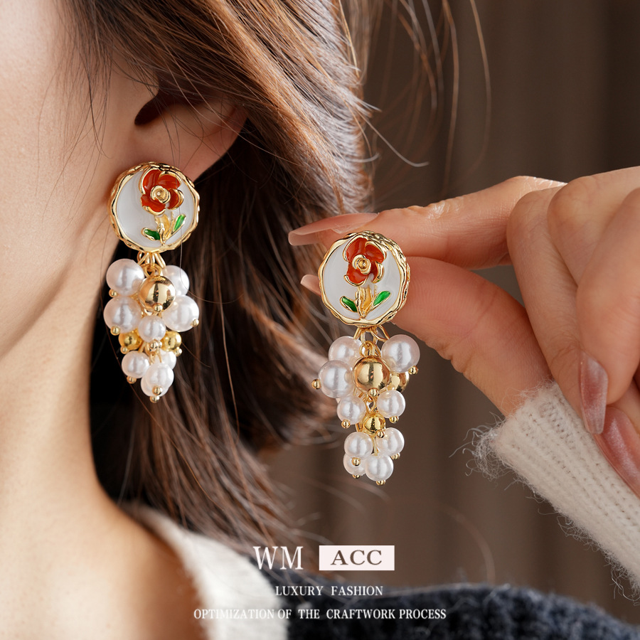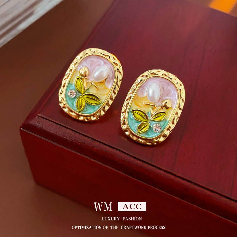 中古vintage宫廷风耳环真金电镀银针滴油花朵珍珠耳钉高级感耳饰