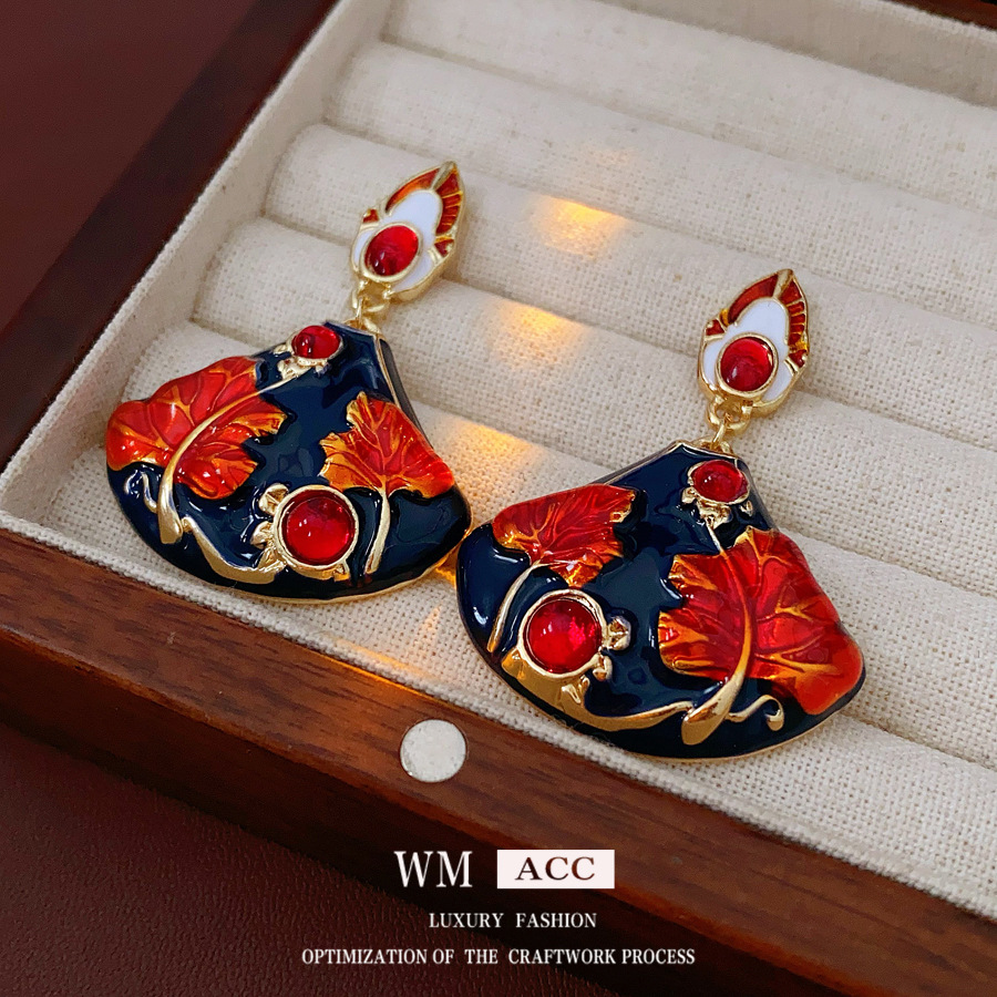中古vintage夸张耳环女银针滴油枫叶扇形耳钉轻奢高级感重工耳饰