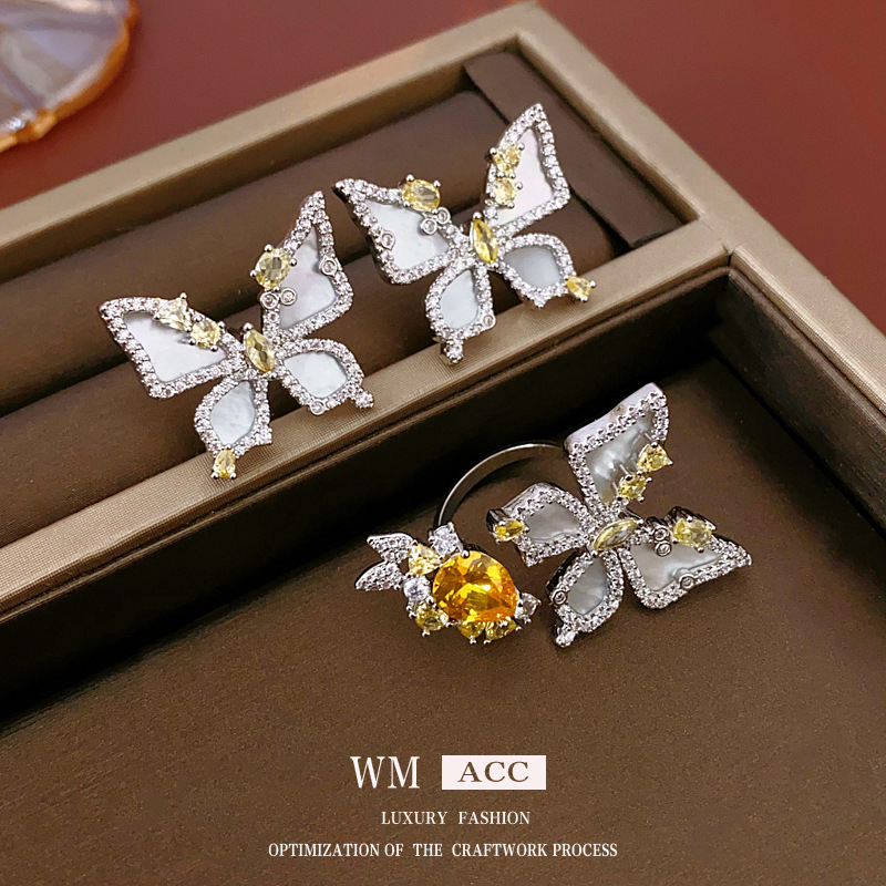 中古vintage蝴蝶开口戒指镶钻锆石花朵食指戒时尚轻奢高级感手饰