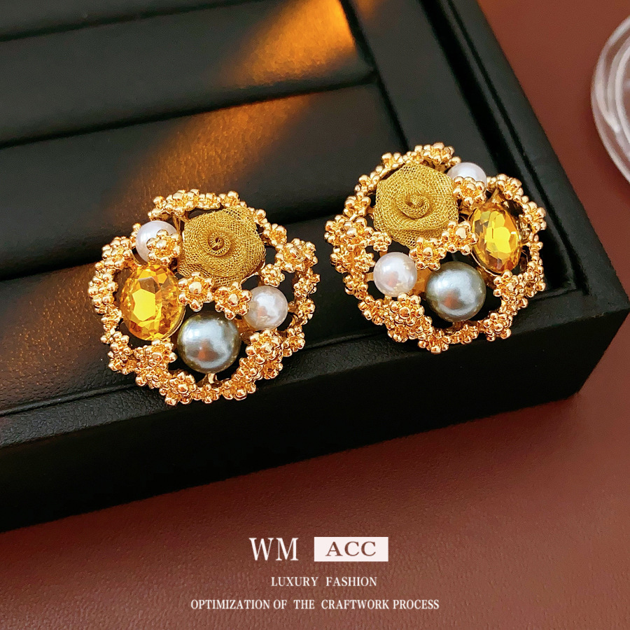 中古vintage轻奢耳环女银针花朵珍珠耳夹百搭高级感复古重工耳饰