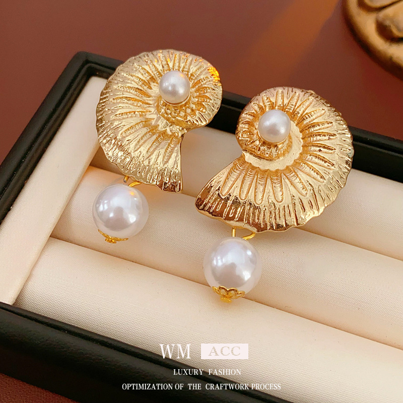 中古vintage气质耳环银针海螺珍珠耳钉高级感时尚复古耳饰女批发