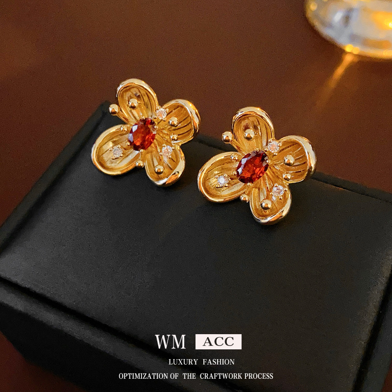 中古vintage花朵耳钉真金电镀银针锆石耳环高级感时尚复古耳饰女