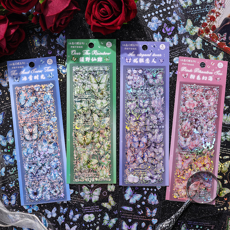 悦诗水晶闪蝶系列烫银咕卡手账贴纸包ins风镭射防水PET手帐素材