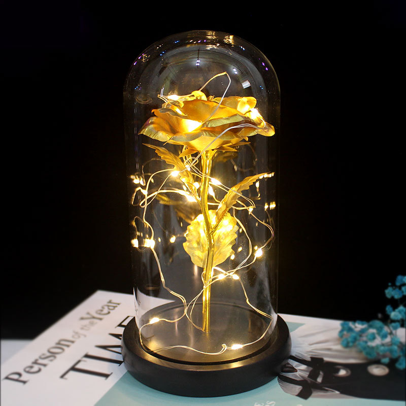 外贸专供LED灯玻璃罩镀金玫瑰圣诞摆件送闺蜜生日礼物24K金箔玫瑰