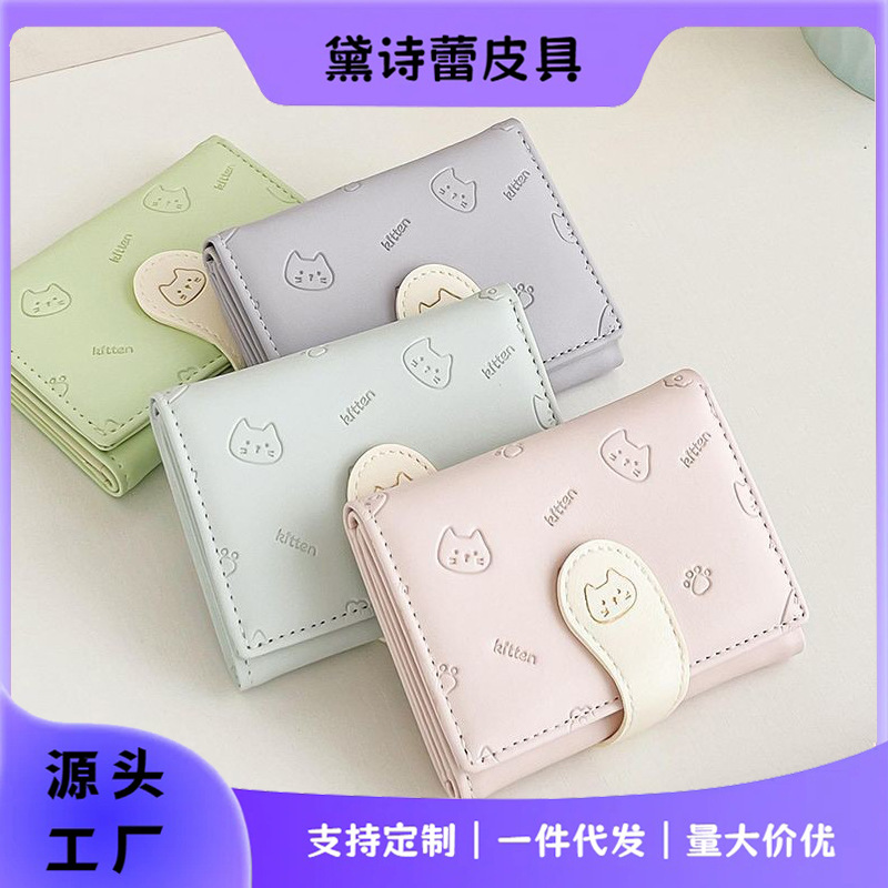 可爱卡通猫咪短款三折钱包女新款小清新多卡位小众学生零钱包卡包