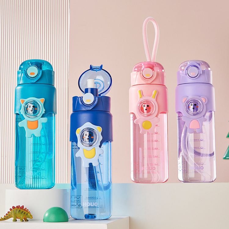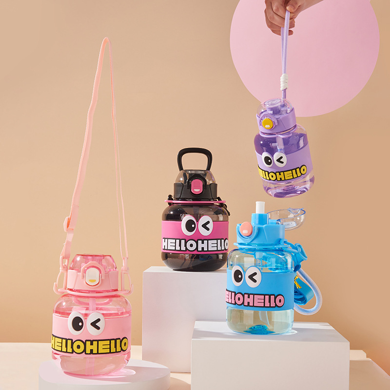 儿童创意卡通塑料水杯可拆卸肩带提手吸管杯便携学生男女防漏水杯