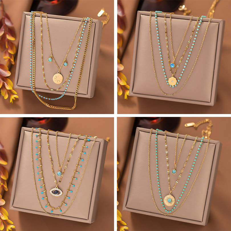 欧美跨境 新款不锈钢饰品米珠四层项链女个性眼睛项饰 时尚锁骨链