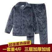 棉睡衣男冬季三层加厚加绒珊瑚绒夹棉男士法兰绒中老年家居服套装