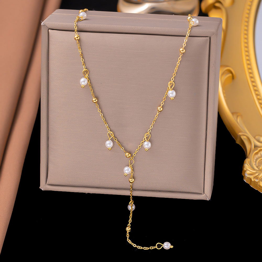 marka法式风格仿珍珠项链流苏锁骨链钛钢18k金颈链ins风饰品