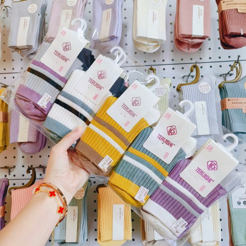女士条纹袜子秋冬季加厚款中筒袜ins潮吸汗透气双针棉袜诸暨批发