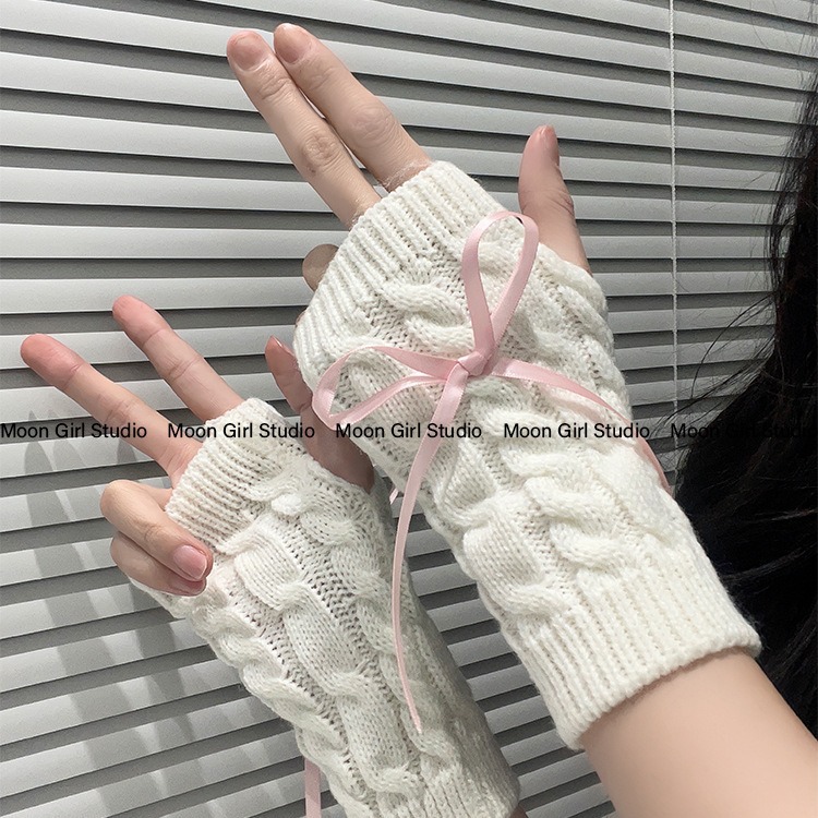 秋冬保暖半指手套女甜美可爱蝴蝶结学生毛线触屏露指袖套ins触屏