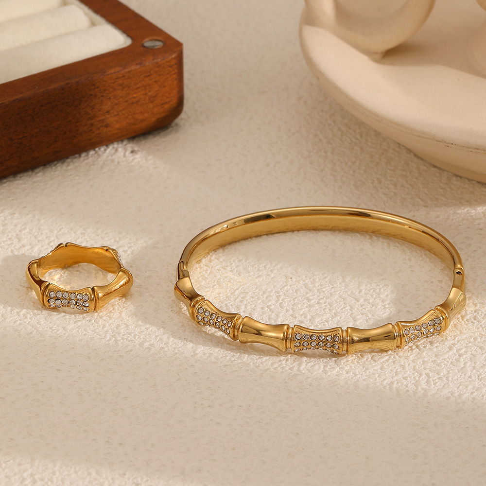 跨境欧美镶钻不锈钢手镯戒指手饰套装竹节纹理时尚高级感钛钢指环