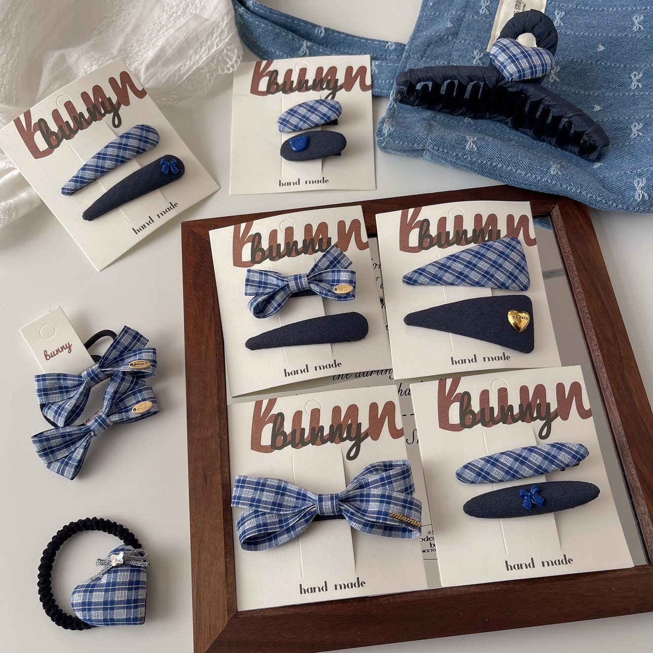 蓝色高智格纹发夹蝴蝶结发圈发夹气质优雅发绳发圈爱心金标抓夹发