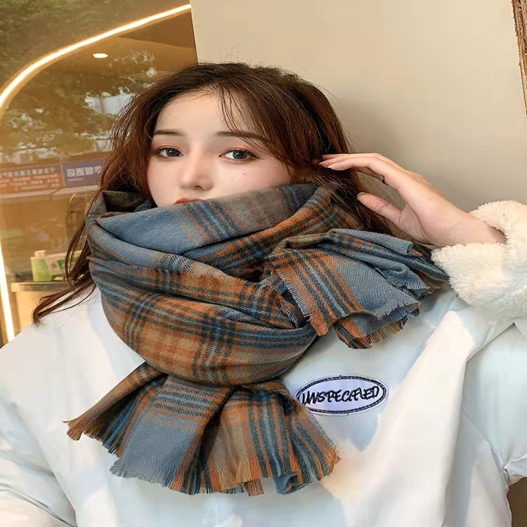 围巾女秋冬保暖仿羊绒日系复古格子围巾双面流苏披肩学生情侣围脖