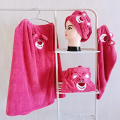 家用浴裙可穿可裹浴袍少女心擦头巾干发帽玫红卡通草莓熊浴裙浴帽