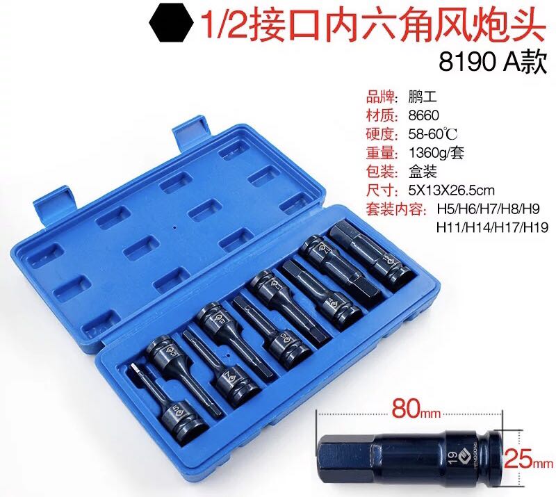 连体风炮批头 1/2气动内六角套筒 80长压批套筒旋具头套装