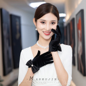 新娘旅拍照黑色丝绒手套法式名媛晚礼服配饰短款蝴蝶结珍珠手套女
