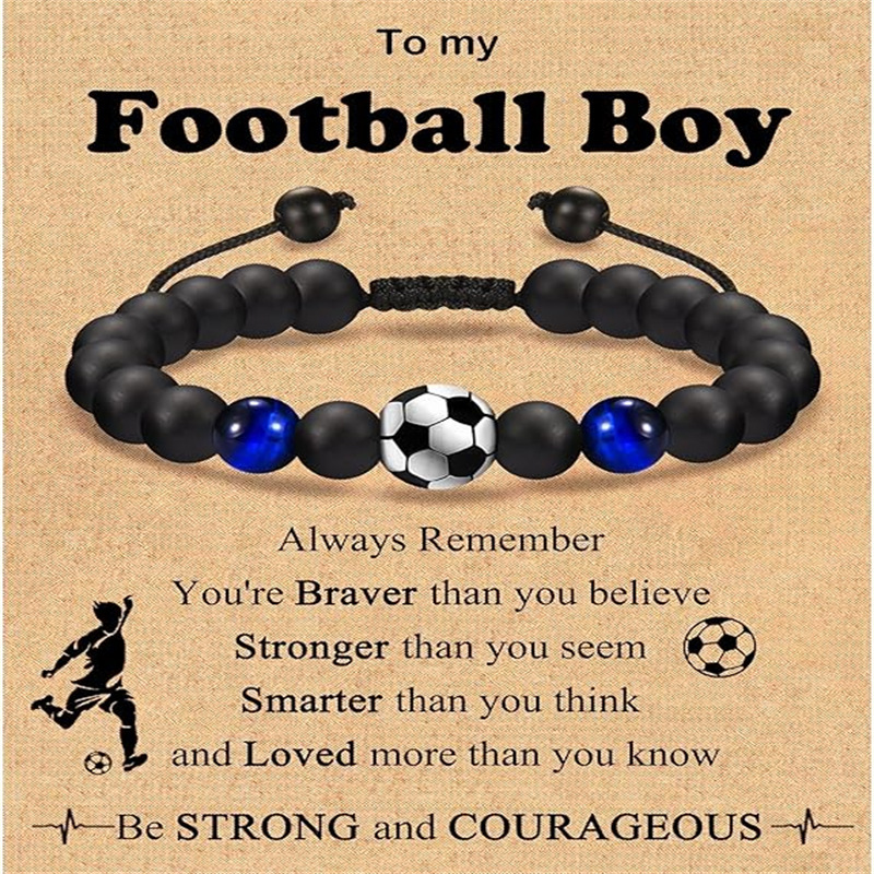 足球串珠手链to my son礼物黑磨砂橄榄球篮球手串虎眼石 棒球手链