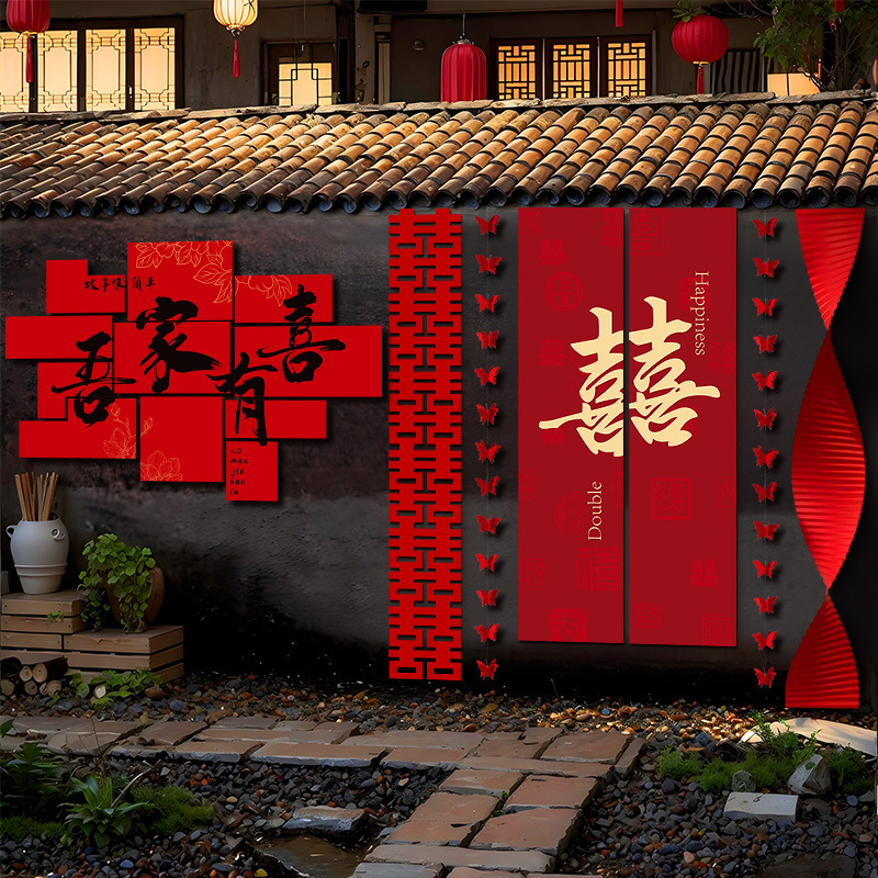 婚房布置套装农村结婚自建房婚礼院子喜字kt板挂布拉花背景墙装饰