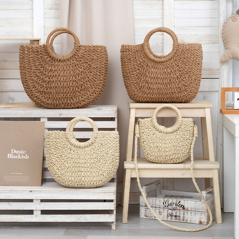 现货供应 ins草编包2025新款休闲度假手提沙滩包手工编织半圆包
