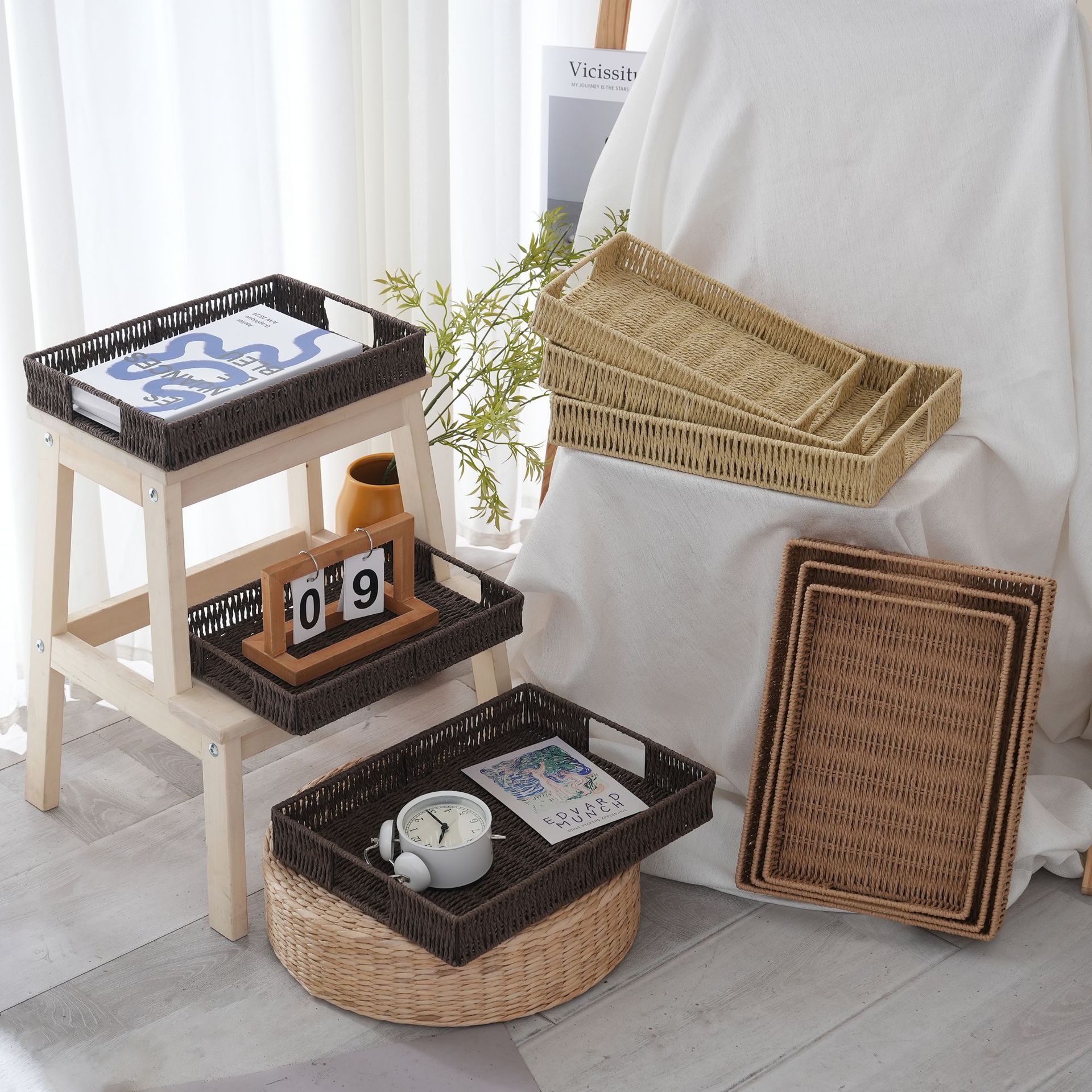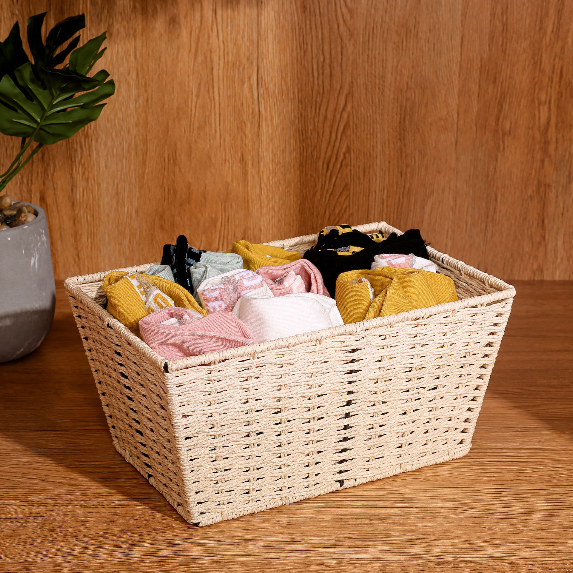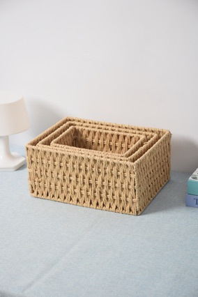 藤编桌面化妆品收纳筐卧室橱柜抽屉内衣收纳筐纸绳编织篮梯形篮子