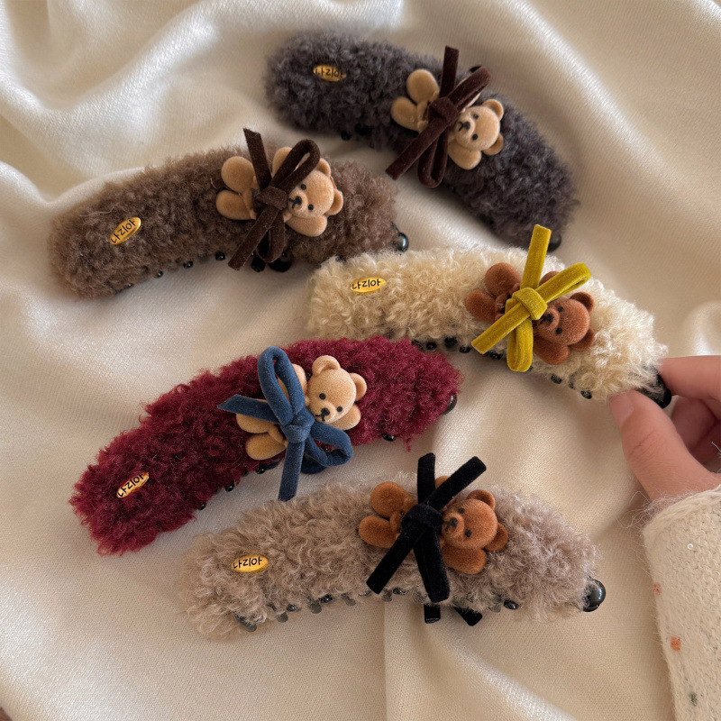 可爱卡通小熊毛绒发夹女后脑勺马尾香蕉夹盘发竖夹新款发卡子头饰