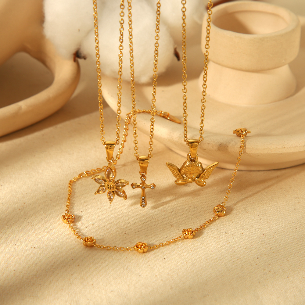 欧美热卖轻奢设计玫瑰花吊坠饰品项链女钛钢18k金不掉色十字手链