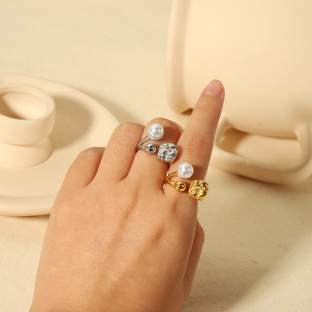 欧美法式复古设计小众时尚戒指18K金不锈钢珍珠熔岩开口戒高级感