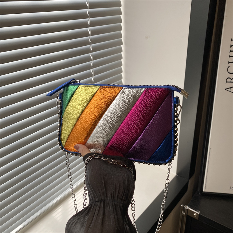2024秋季新款韩版时尚拼接ins洋气链条单肩斜挎小方包斜条纹女包