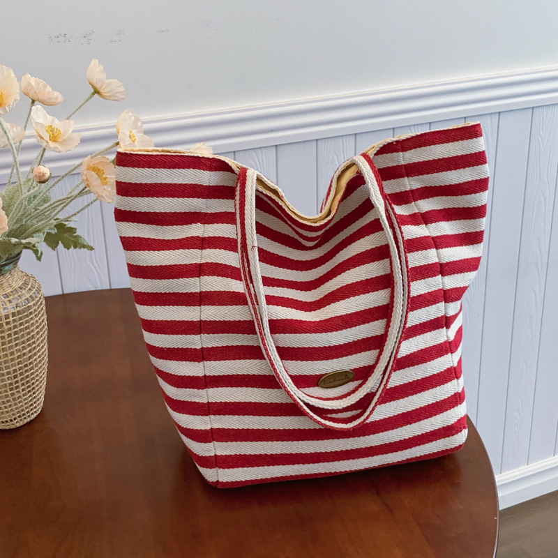 个性条纹耐磨帆布包2024新款韩风ins休闲包时尚大容量单肩托特包