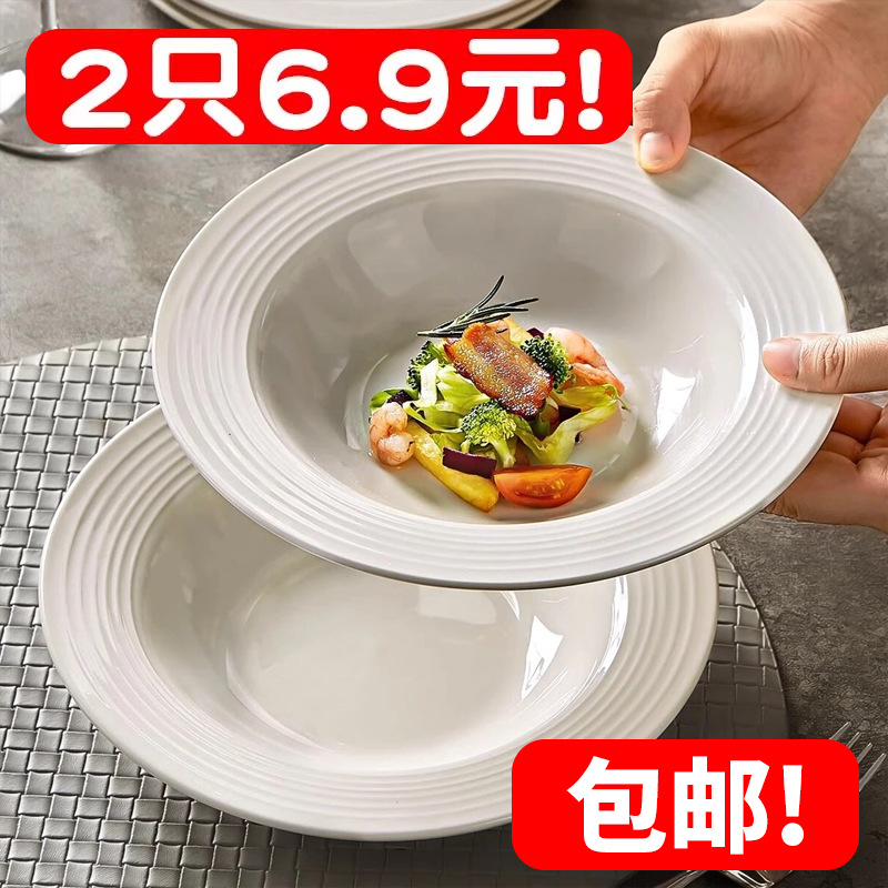 6.9元两只装!盘子菜盘8.75英寸陶瓷家用意面西餐螺纹纯白草帽盘