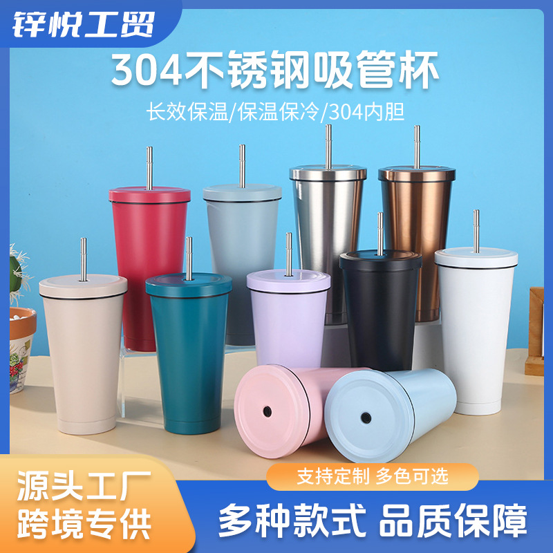 新款316不锈钢咖啡杯女生高颜值双饮吸管保温杯内喷陶瓷水杯代发