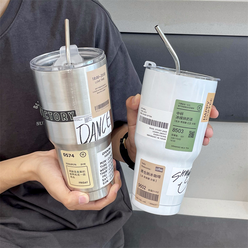 跨境外贸304不锈钢吸管杯汽车杯黑边盖咖啡杯750ml大容量保温杯