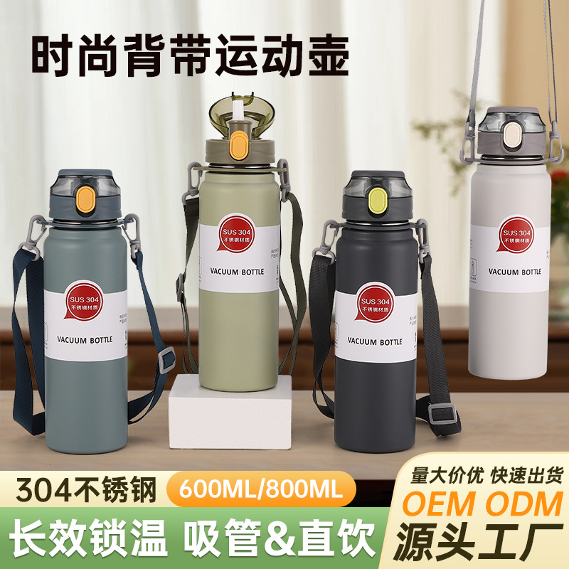 新款健身不锈钢水杯学生运动水杯大容量提绳保温杯弹跳斜跨背带壶