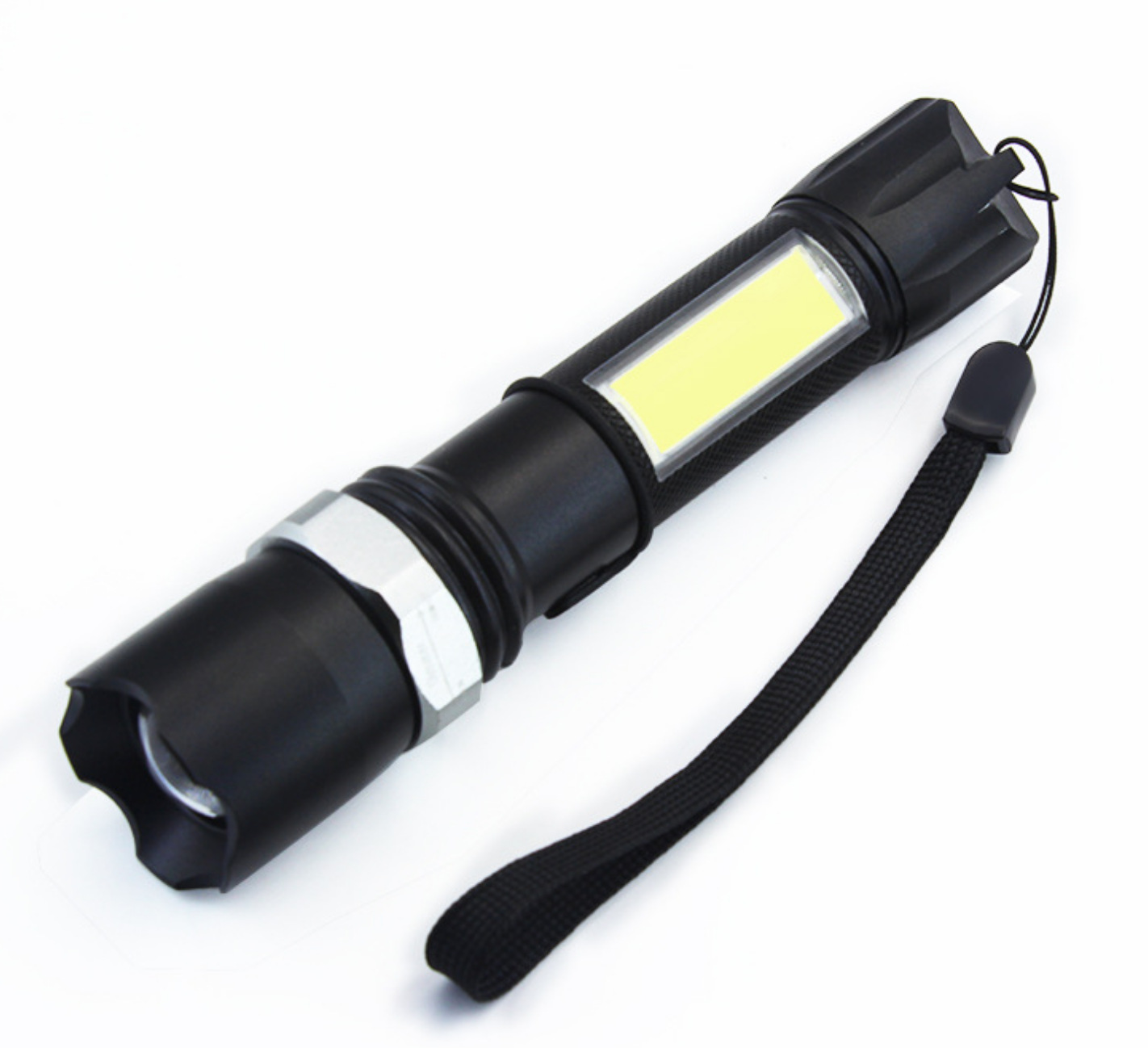 外贸专供 USB充电强光手电筒 铝合金变焦COB防水手电 多功能手电