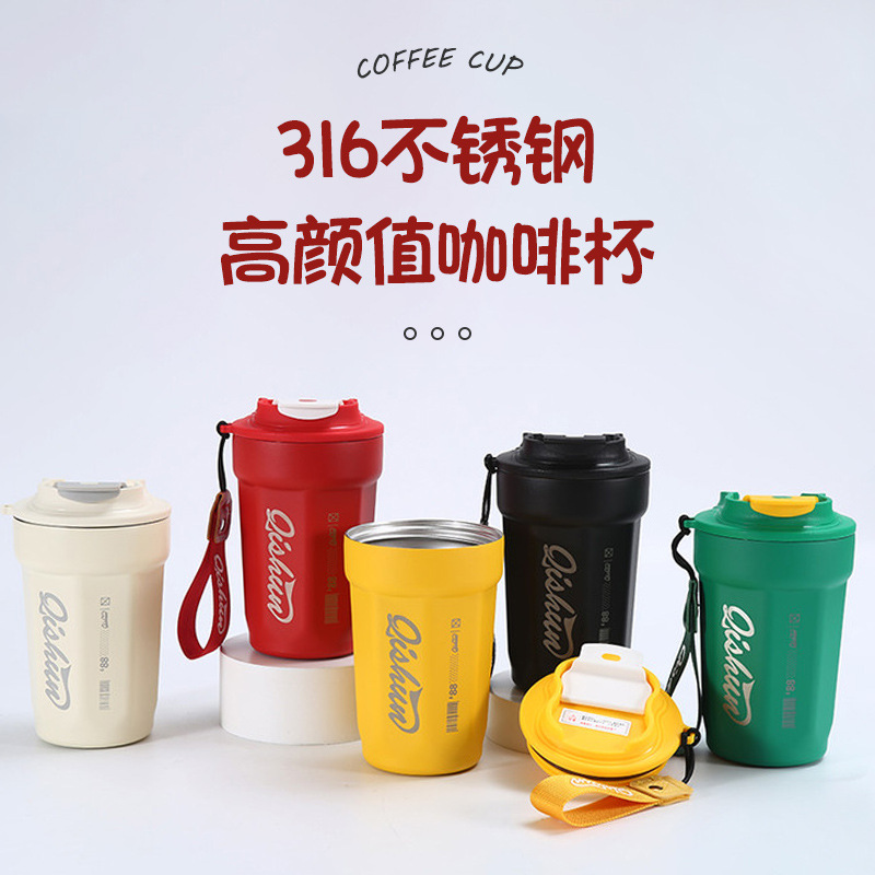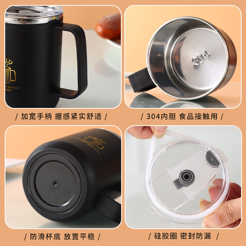 新款不锈钢咖啡杯双层304真空保温杯便携式双盖吸管杯密封杯批发