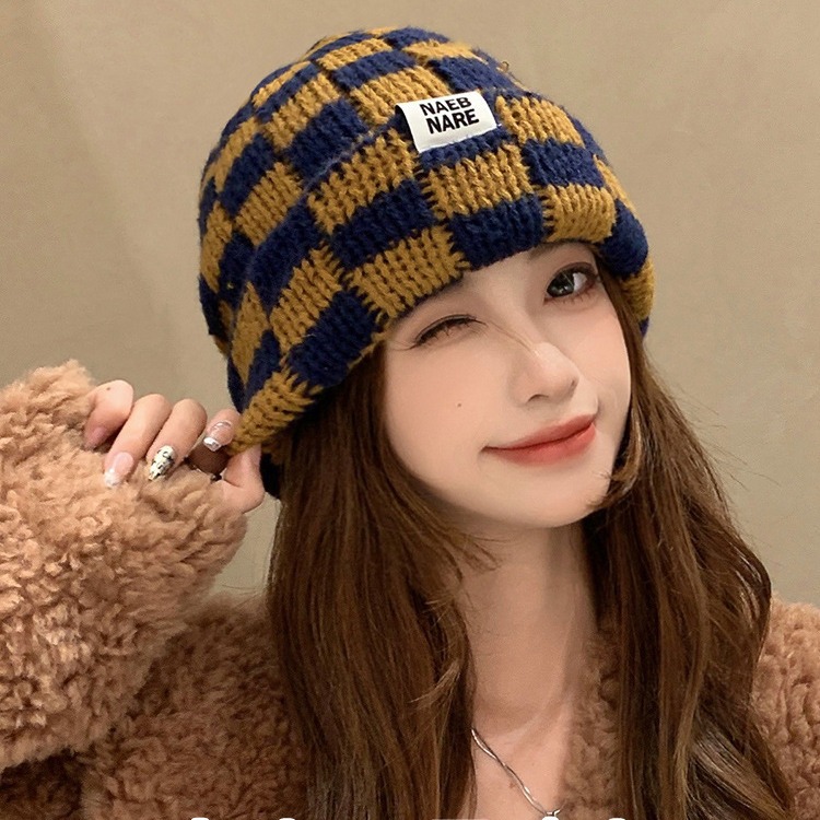 棋盘格子针织帽女秋冬季新款韩版小众大头围毛线帽显脸小保暖帽子