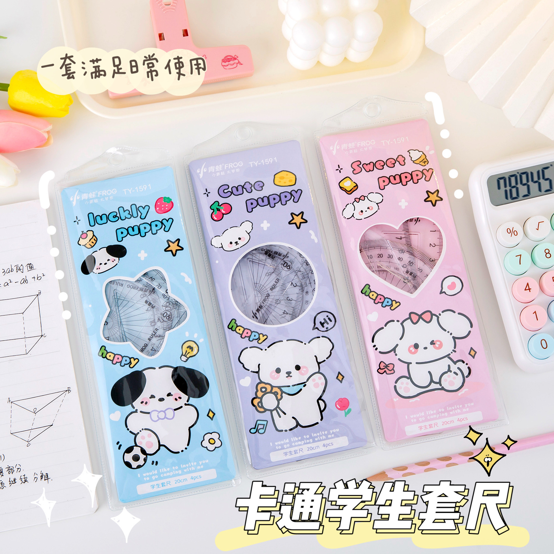 可爱高颜值套尺四件套学生学习用品直尺三角尺量角尺透明尺子批发