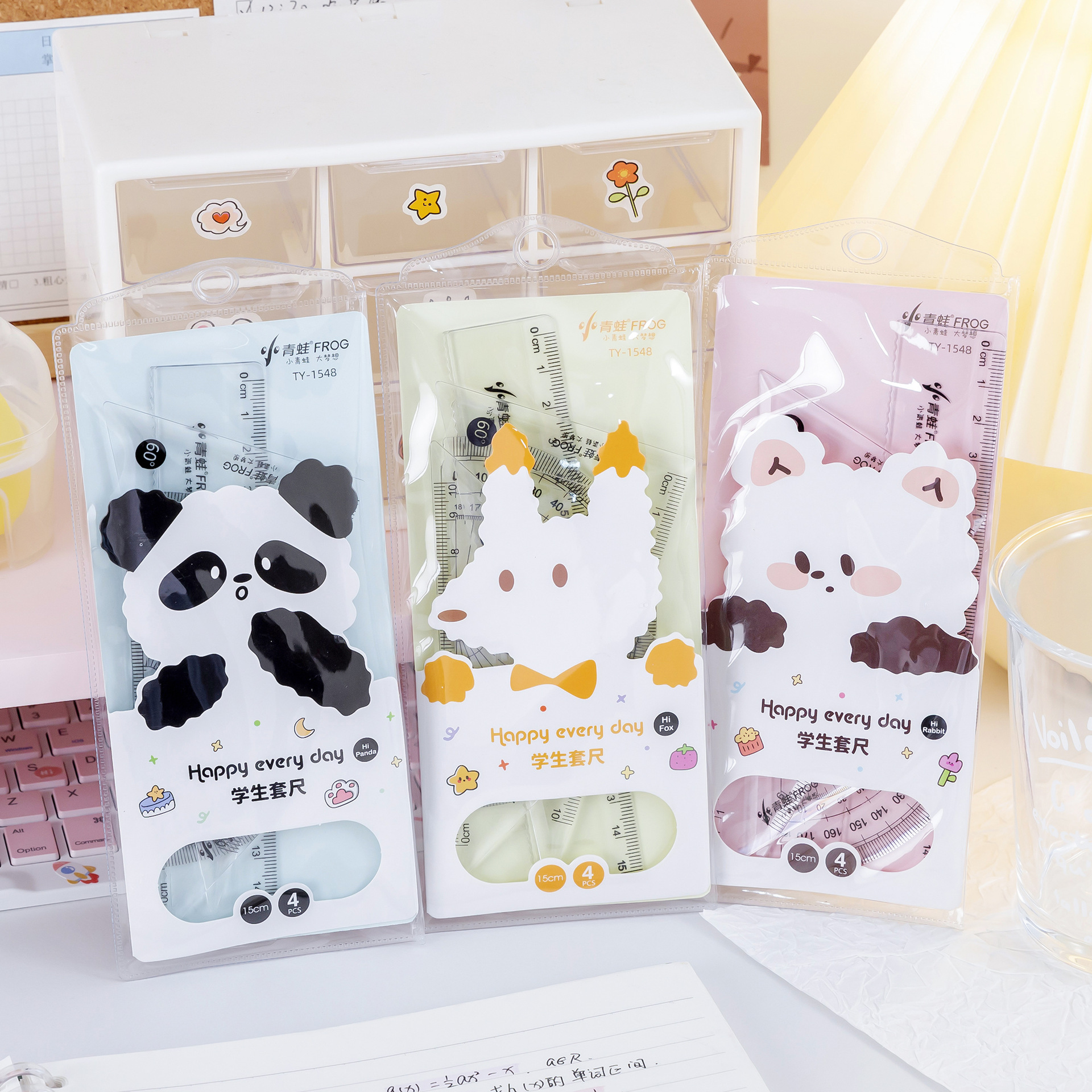 学生四件套尺可爱卡通熊猫卡皮学生测量尺子透明直尺励志四件套尺